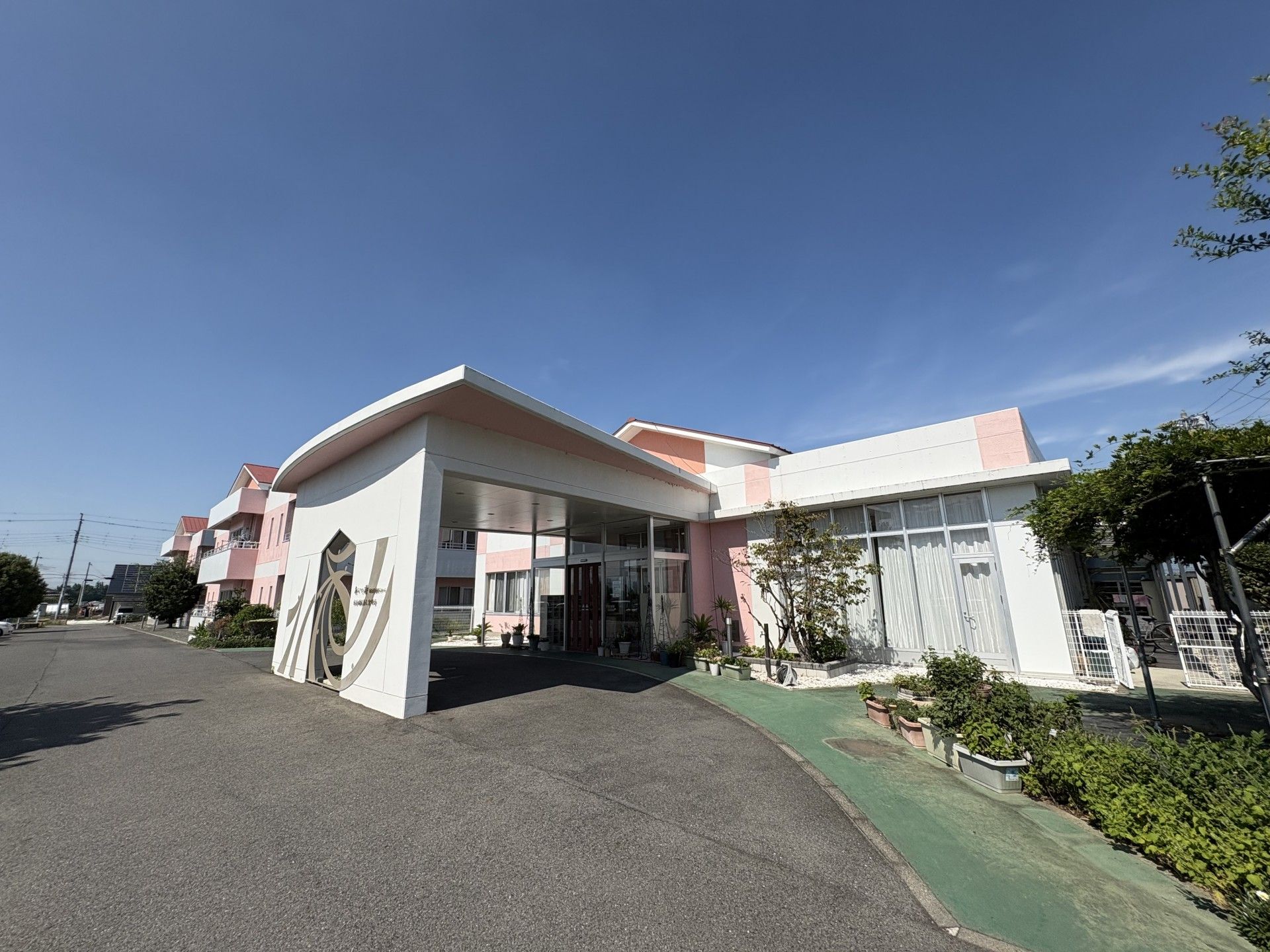 広々とした駐車スペースがあり、車でのアクセスが便利です。建物の外観は明るく親しみやすい印象です。