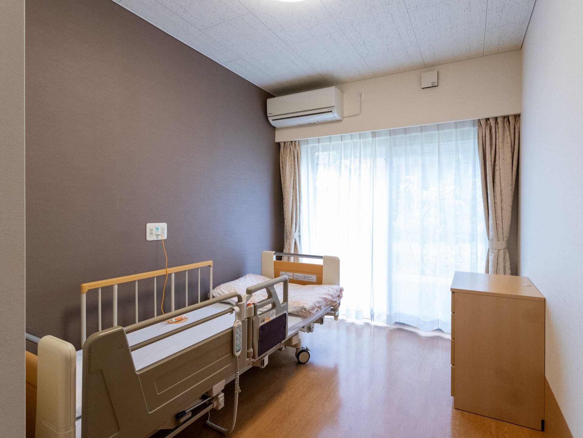 ゆとりのある広さの個室には、ベッド・クローゼット・エアコン・トイレが完備されています。居住空間でのプライバシーを確保し、これまでの生活に近い環境をご用意しております。車いすの方にも十分なスペースを確保し、安全で快適にお過ごしいただけます。