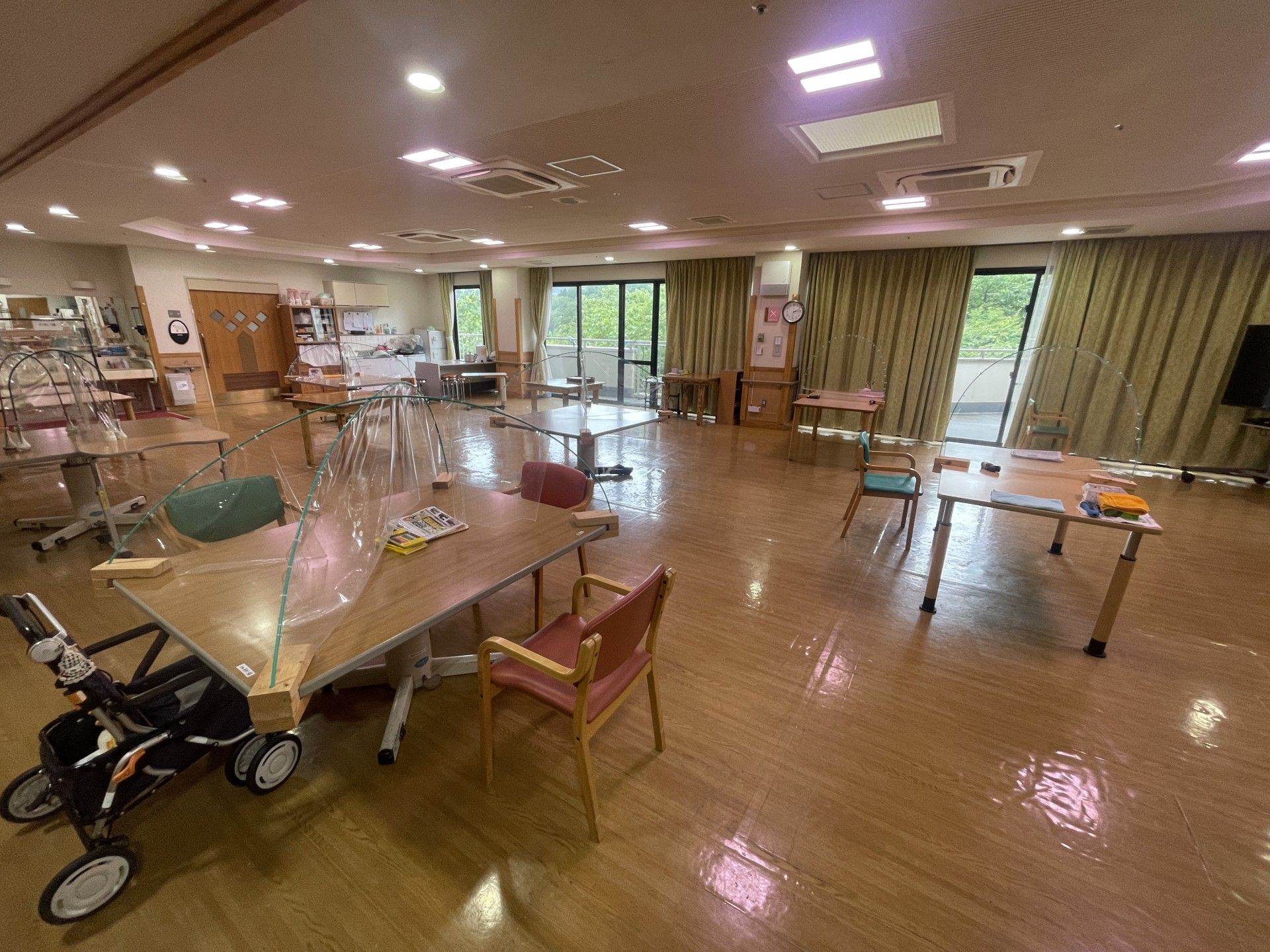テーブルが配置された広い空間で、ゆったりとした時間を過ごせます。交流や活動に最適です。