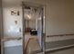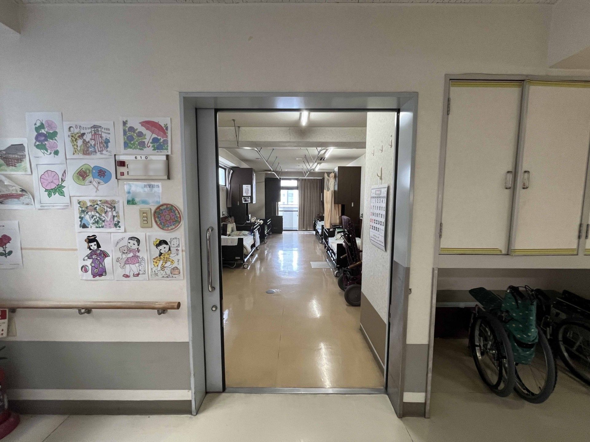 居室の入口には、手すりが設置されており、安心して移動できます。壁には季節の絵が飾られています。