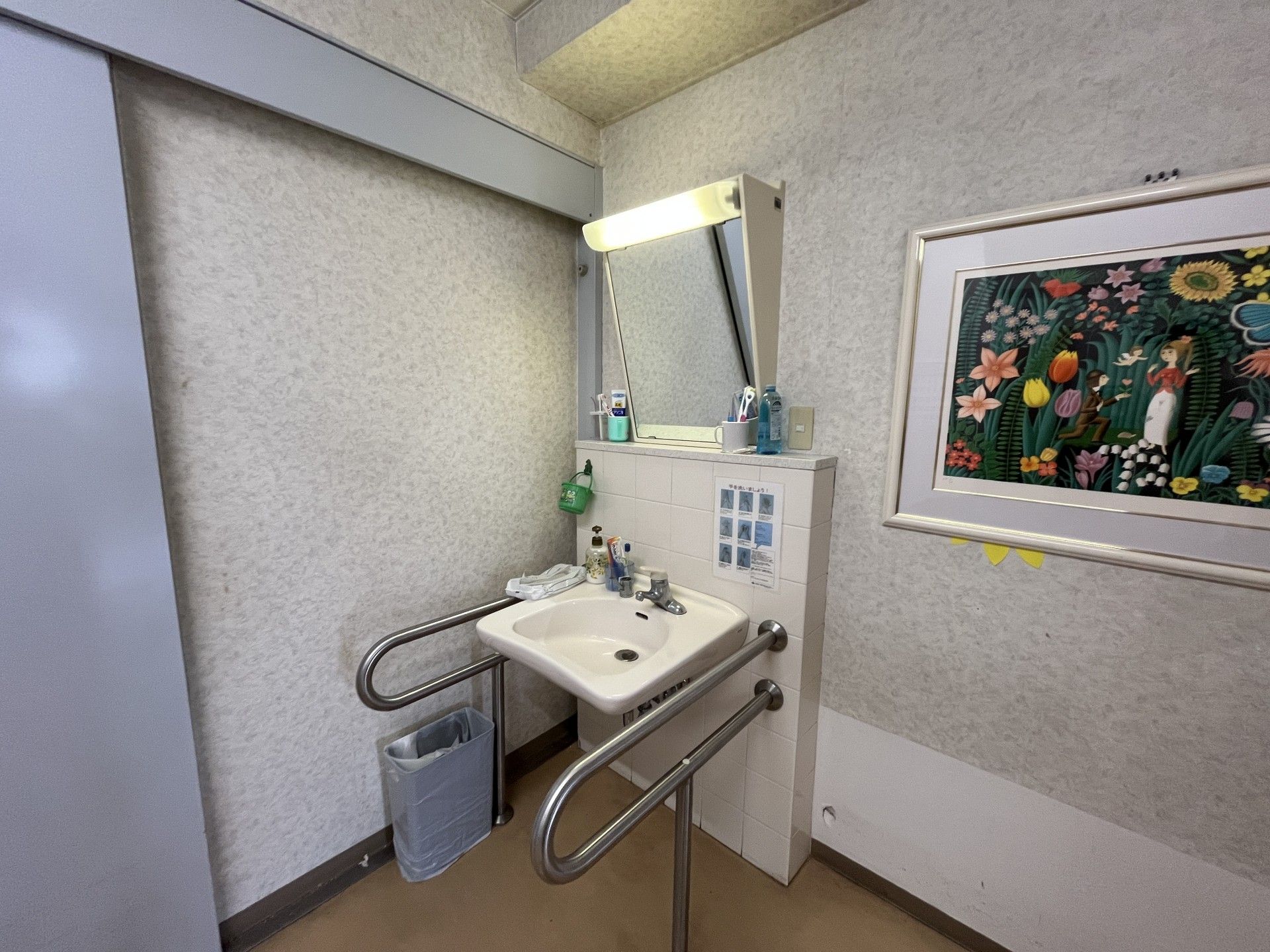 手すり付きの洗面台は、立ち座りがしやすく安心してご利用いただけます。