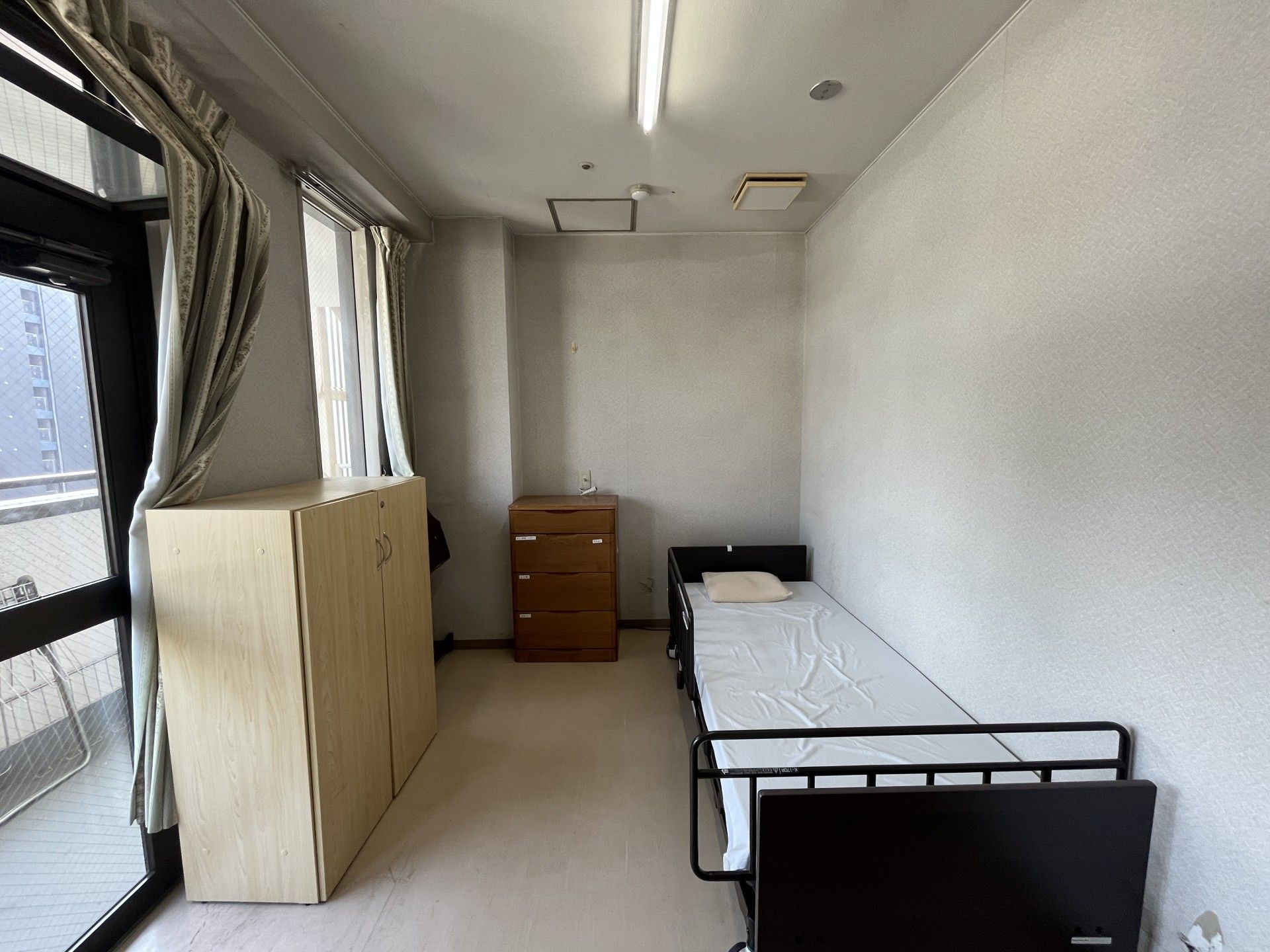 窓からの自然光が心地よい空間です。ベッドと収納が整い、快適に過ごせます。