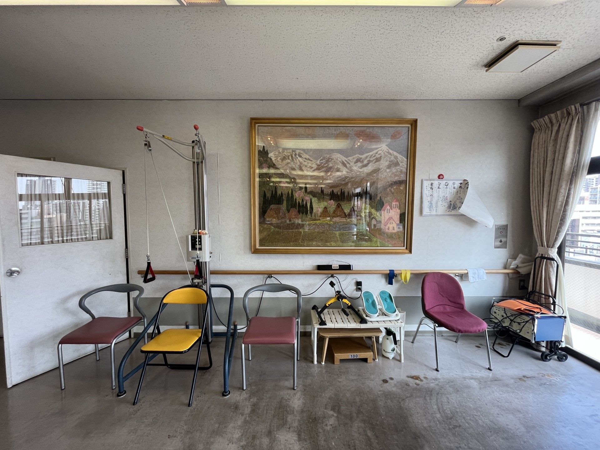 リハビリ用具が整った空間で、安心して運動に取り組めます。絵画が飾られた壁が落ち着きを与えます。