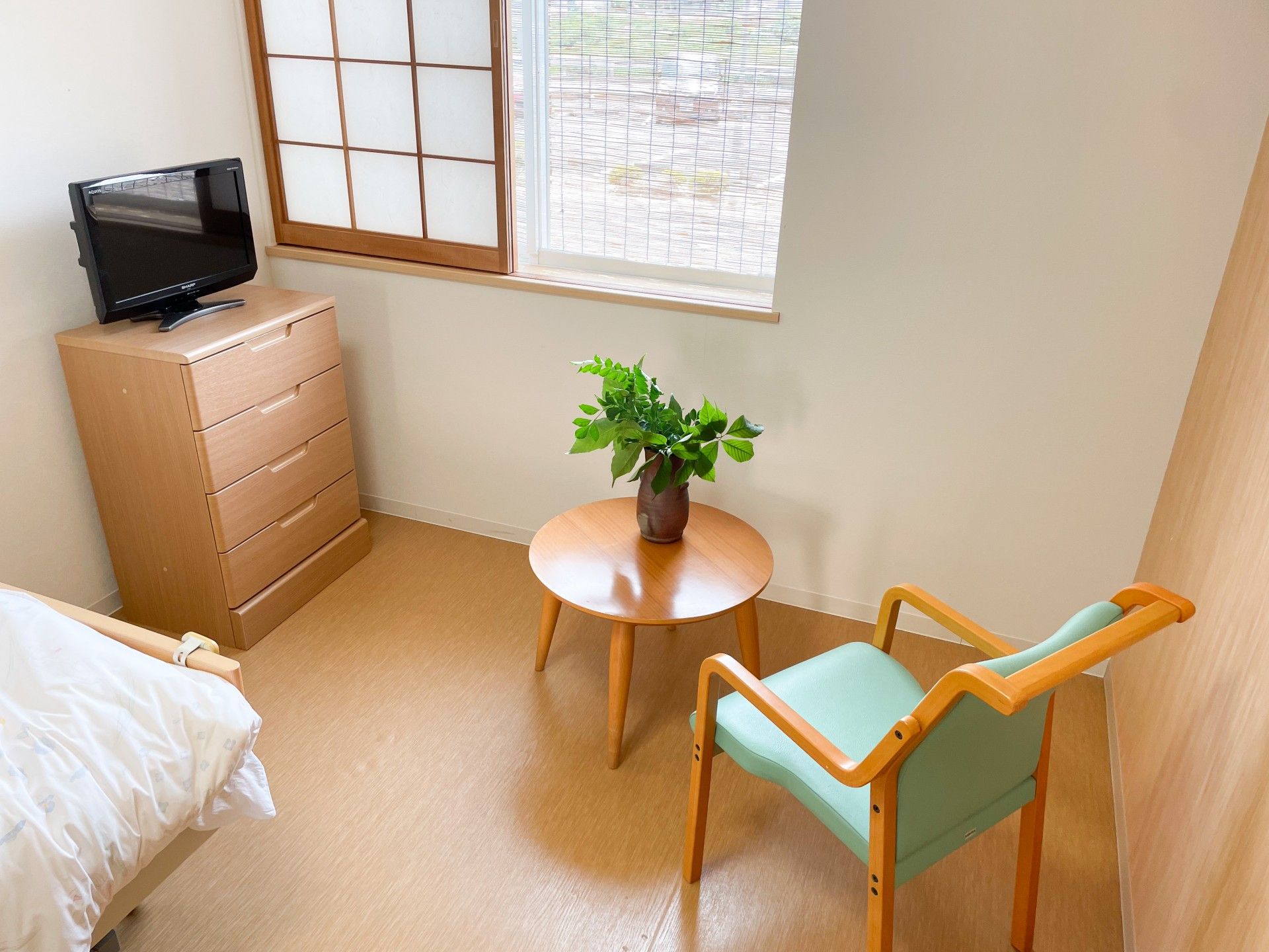 窓からの自然光が心地よい空間です。ベッドと椅子が配置され、くつろぎの時間をお過ごしいただけます。