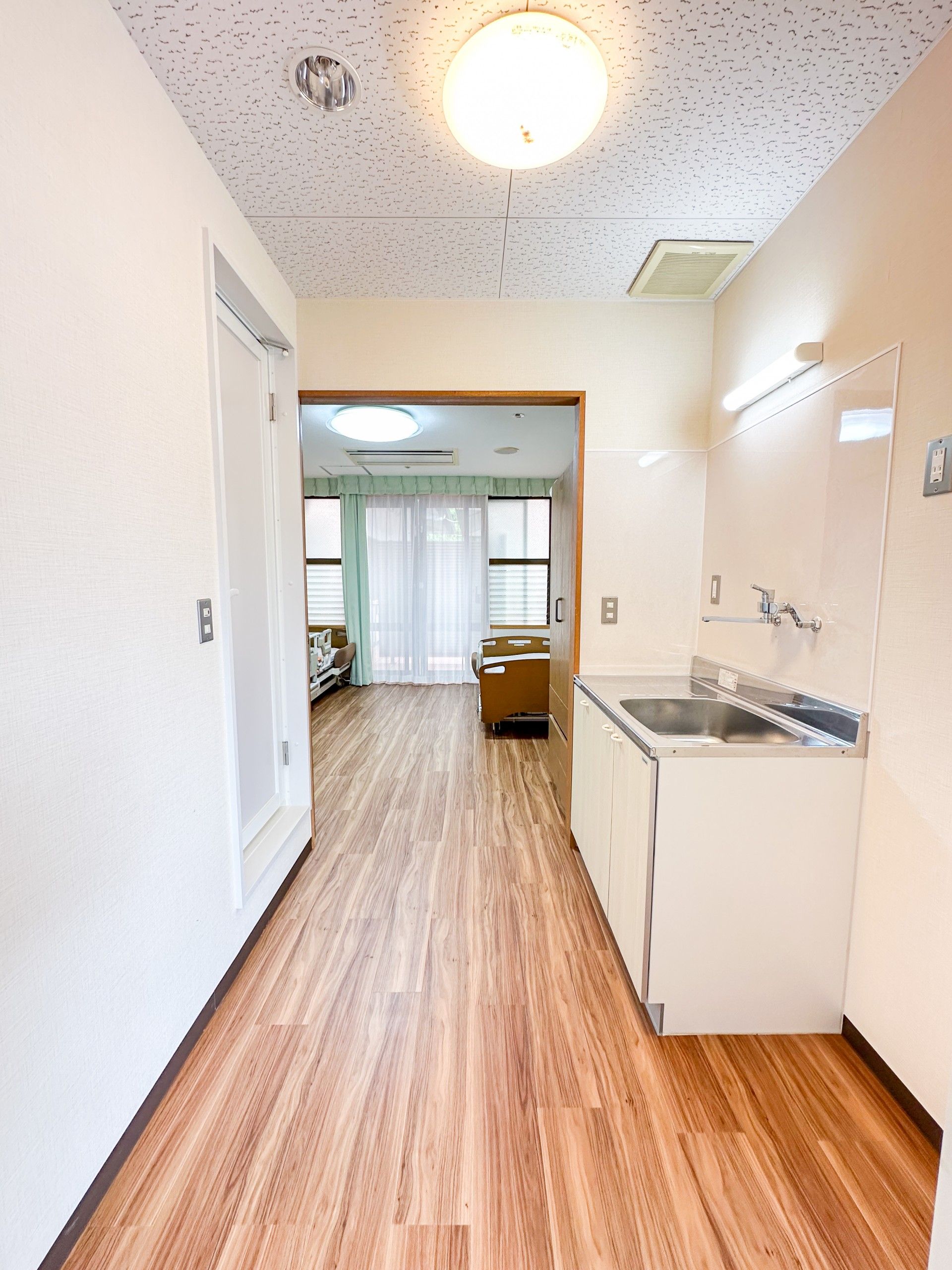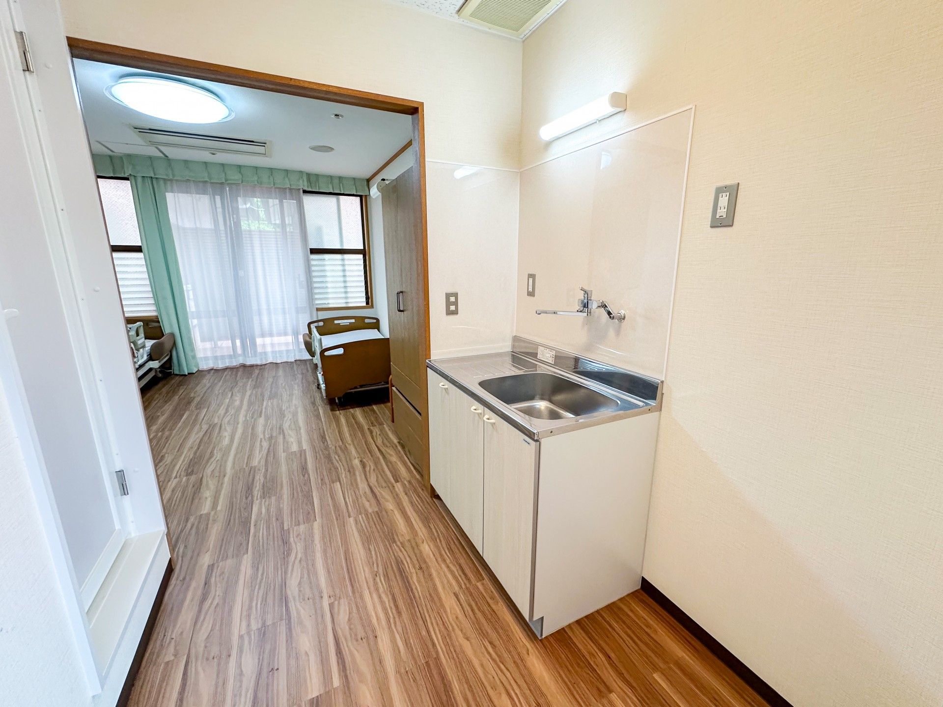 2022年5月にリニューアルした栄光園では、4人部屋だった多床室を個室のようにしきり、プライバシーと安全の両方を確保しています。会話のしやすさなど多床室の良い部分は残しつつ、個室感覚でお過ごしいただけます。居室総数15室、居室面積は21.3~42.6㎡のゆとりある空間です。感染症対応型のショートステイは全室ユニットバス、ミニキッチン、ベッド、家具、Wi-Fi環境等を完備し、スタッフとの接触も最小限に抑えた設計になっています。
