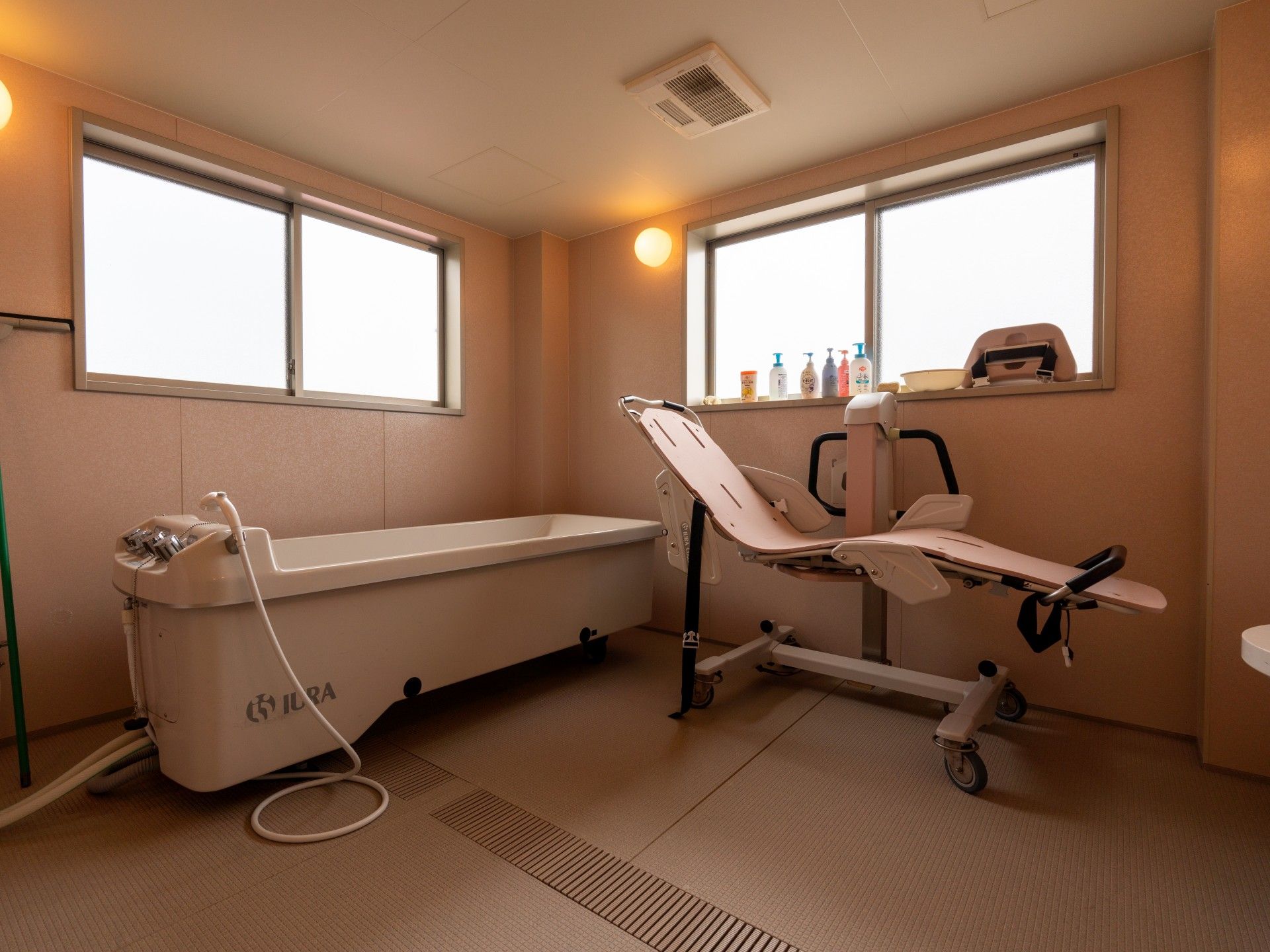 広々とした入浴スペースで、リフト付きの椅子が安全で快適な入浴をサポートします。