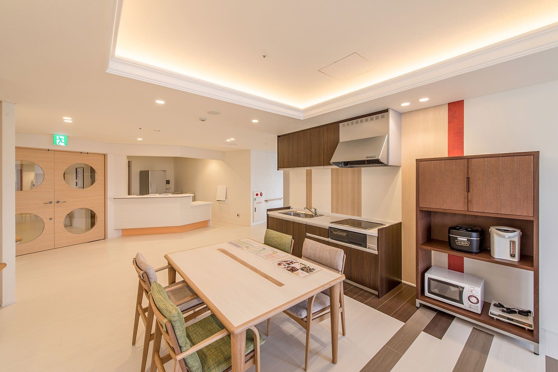 施設内には間接照明が優しく照らす食堂を設け、ご利用者様の憩いの場としています。共用トイレは車椅子対応が4か所あり、バリアフリー設計となっています。入浴設備は個浴3か所と特殊浴槽1か所を完備し、身体状況に合わせた入浴サービスを提供いたします。定期的に外部のボランティア団体による訪問イベントも開催しており、フラダンスサークルの皆様による優雅な踊りを楽しむなど、豊かな時間を過ごしていただけます。