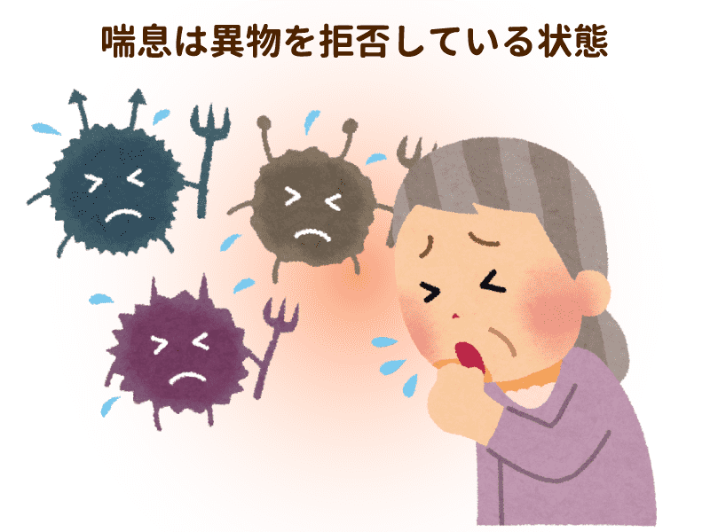 その状態で異物が入ってくると、身体は自分を守るために気管支を収縮させ、喘息の発作を起こすのです。