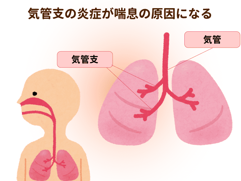 気管支の内側が腫れることで、空気の通り道である気道が狭くなります。