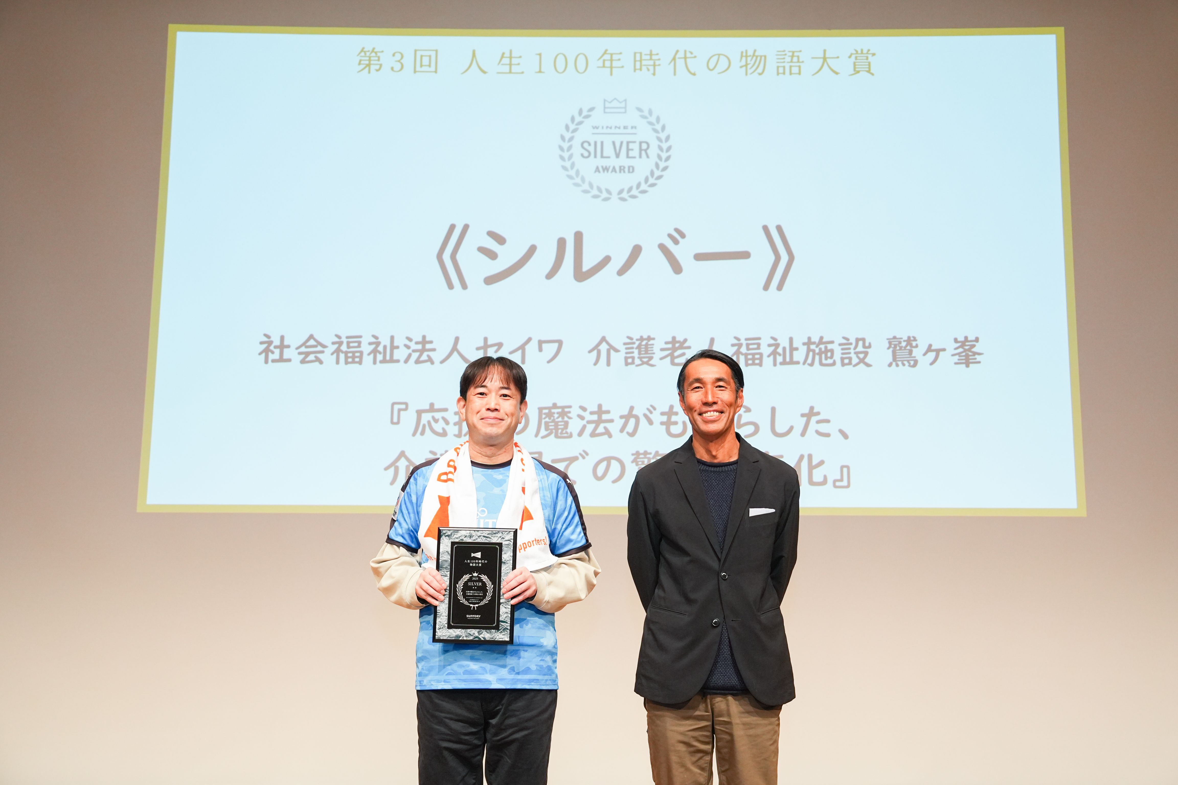 鈴木さんは「本来出席予定だった入居者様の『代わりにとってきて』という力強い言葉に背中を押され、本日は代理で登壇いたしました。3年間の活動を通じ、誰かを応援することは、応援する側にも『必要とされている』という喜びや大きな活力を与えてくれるのだと強く実感しています」と受賞の思いを語りました。