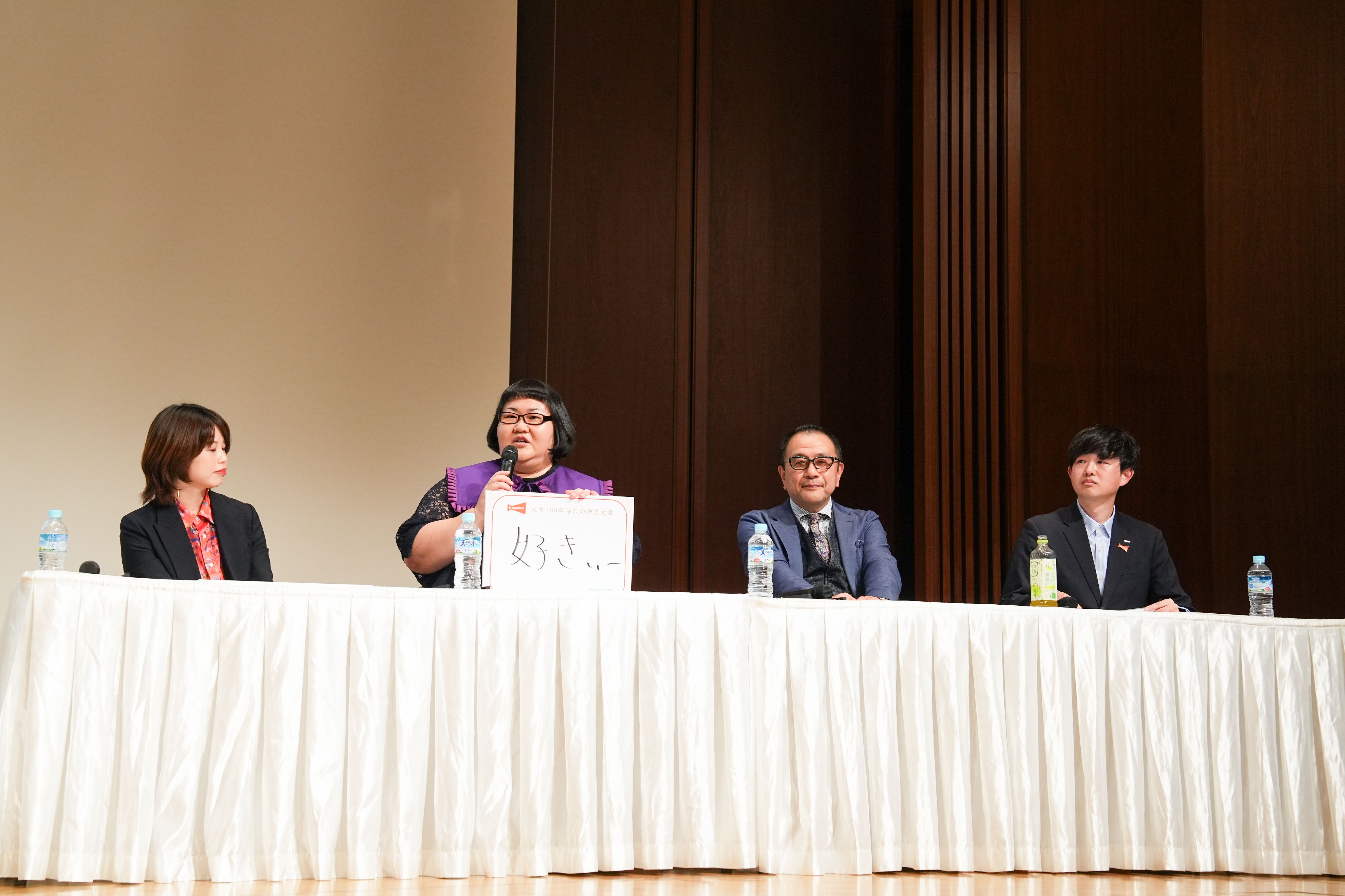 トークセッションの最後に、「あなたの考える、人生100年時代を幸せに生きるヒントとは?」について各登壇者がフリップで回答しました。