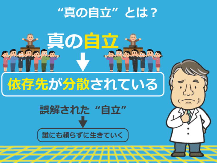 自立とは、自分の人生を助けてくれる依存先が複数に分散されており、自分らしく生きるための自由が確保されている状態のことです。そしてそれが、人間の幸福追求の基礎になっています。