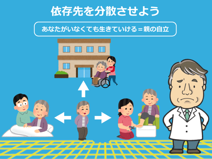 こうした介護は、親は子供の存在がなければ生きられないという「過剰適応」になっているからです。介護が必要になるということは、どうしても他者の手助けが必要になること。だからこそ、そうした他者が複数に分散されることが「過剰適応」を避けるために重要なのです。