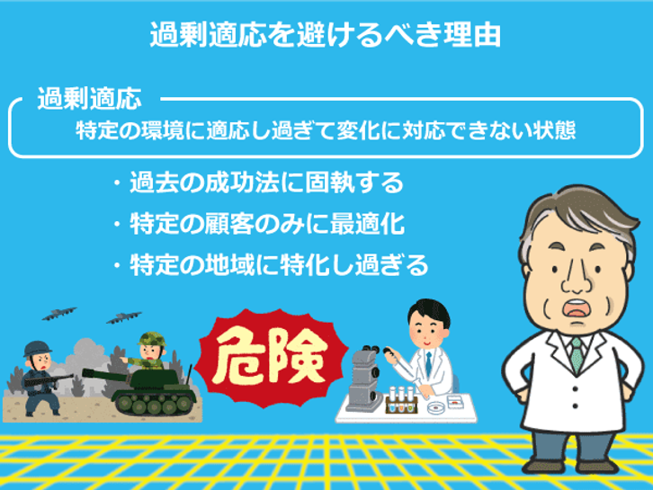 これを企業に置き換えると、特定の顧客に最適化し過ぎたり、特定の地域に特化し過ぎたり、特定の商品に売上を依存し過ぎたりすることは軒並み危険であることがわかります。かつての「液晶のシャープ」がどうなったか思い出してください。そして現在、存続が危ぶまれている大企業は、なぜそのような状況に陥ってしまったのかも考えてみるとわかりやすいはずです。