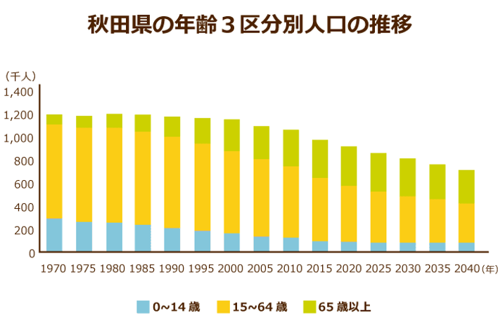 秋田県というのは、全国で最も速いスピードで人口減少が進んでいる県なんです。国立社会保障・人口問題研究所の試算によると、県内人口は2045年までに41%減少して約60万人になり、県内25市町村のうち、大潟村を除くすべてで消滅の可能性が指摘されています。