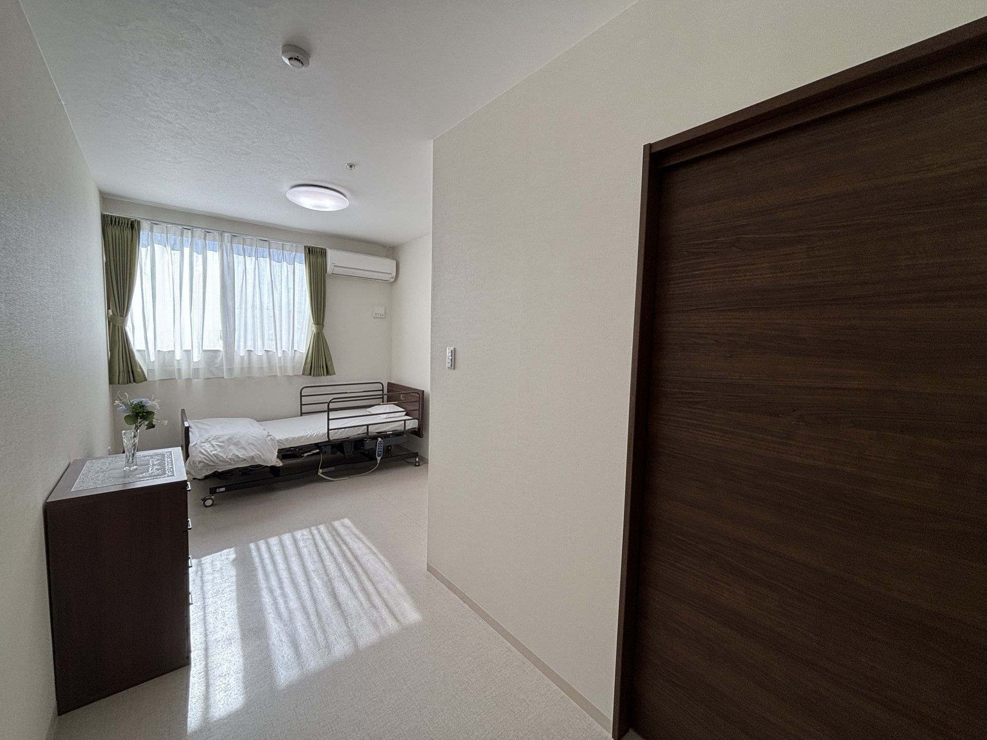 プライベート空間が確保された居室は、全室個室です。お部屋には2モーターのベッド、洗面台、テレビ、ケアコール、エアコン、タンス、寝具があるためカバン一つご入居できるようになっています。トイレも居室にあるので周りに気兼ねなくご利用いただけます。